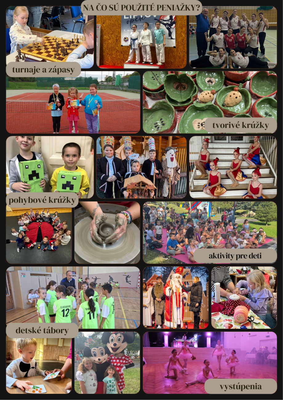 Aj vďaka týmto finančným prostriedkom môžeme pre deti a mládež pripravovať zaujímavé krúžky, tvorivé dielne, športové aktivity, tábory, súťaže a podujatia, ktoré rozvíjajú ich talent, zručnosti a zmysluplné trávenie voľného času.